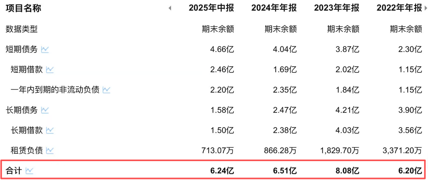 根据招股书数据,公司2022年短期债务2.3亿元,长期债务3.9亿元,总计6.2亿元;2023年短期债务骤增至3.87亿元,长期债务4.21亿元,总计8.08亿元;而到2024年,短期债务4.04亿元,长期债务却大幅降至2.47亿元,总计6.51亿元;2025年上半年短期债务进一步增至4.66亿元,长期债务降至1.58亿元,总计6.24亿元。