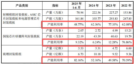 在业绩下滑的同时,越亚半导体的产能利用率也处于令人担忧的水平。2025年上半年,公司FC-BGA载板产能利用率仅为9.32%,射频模组封装载板等产品的产能利用率为48.77%。